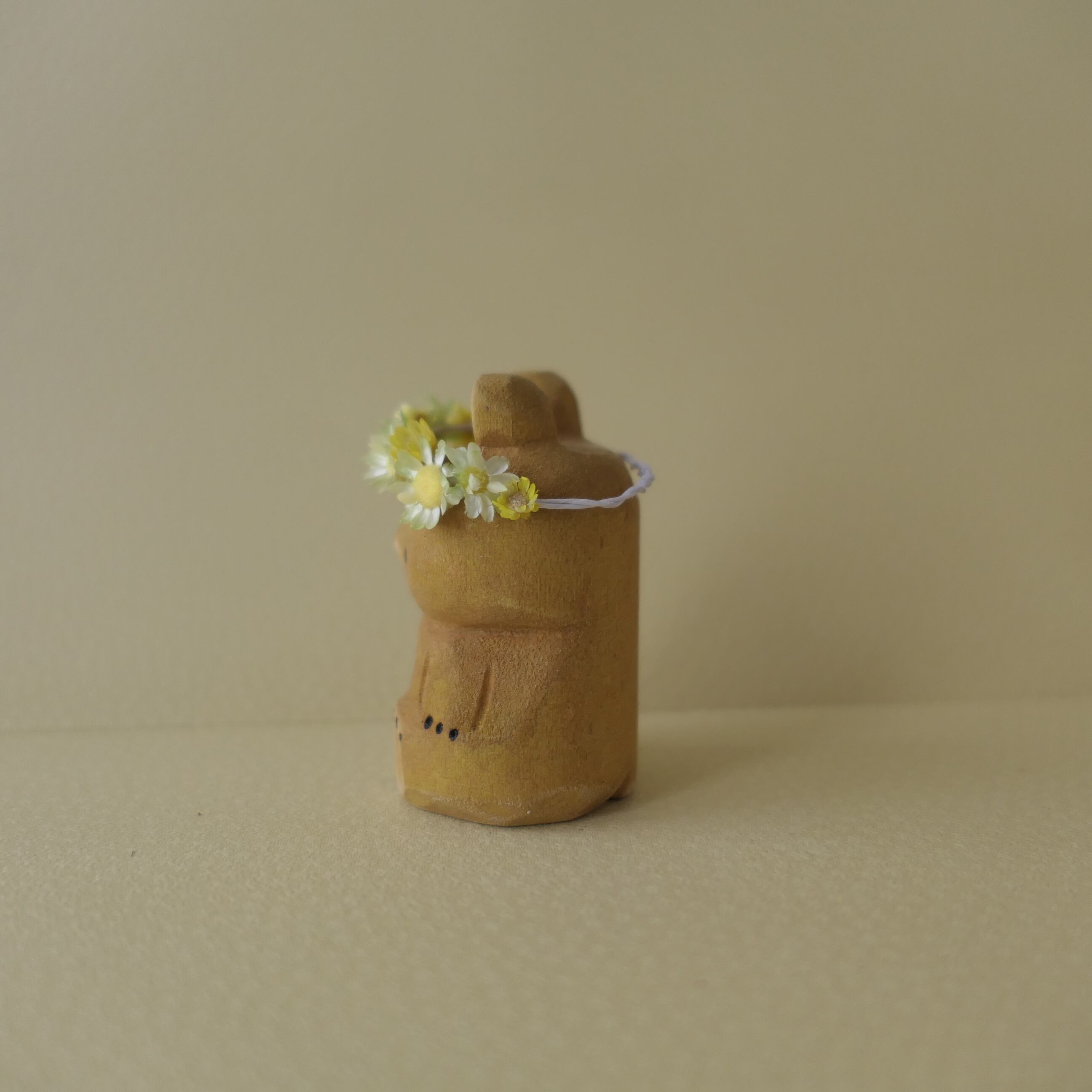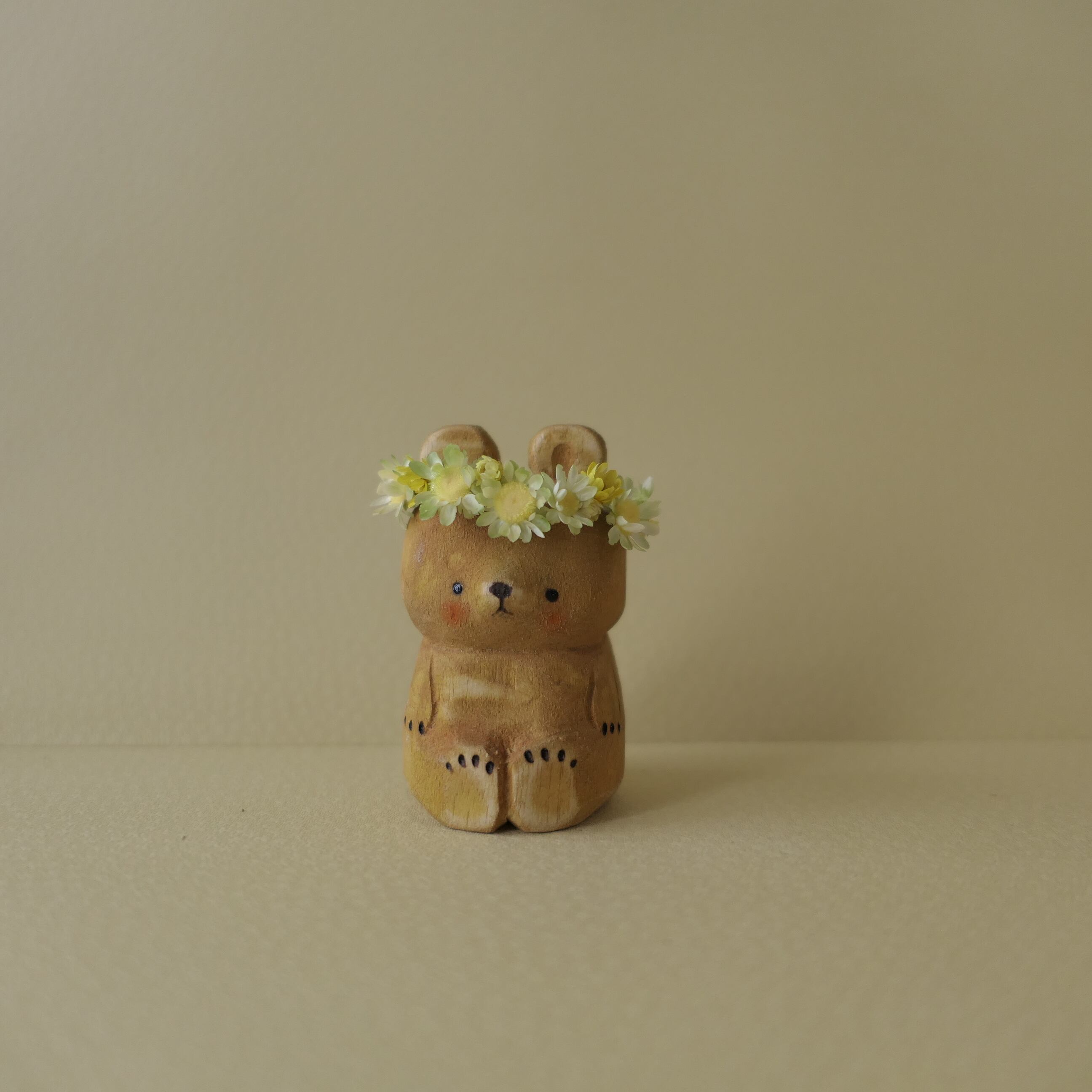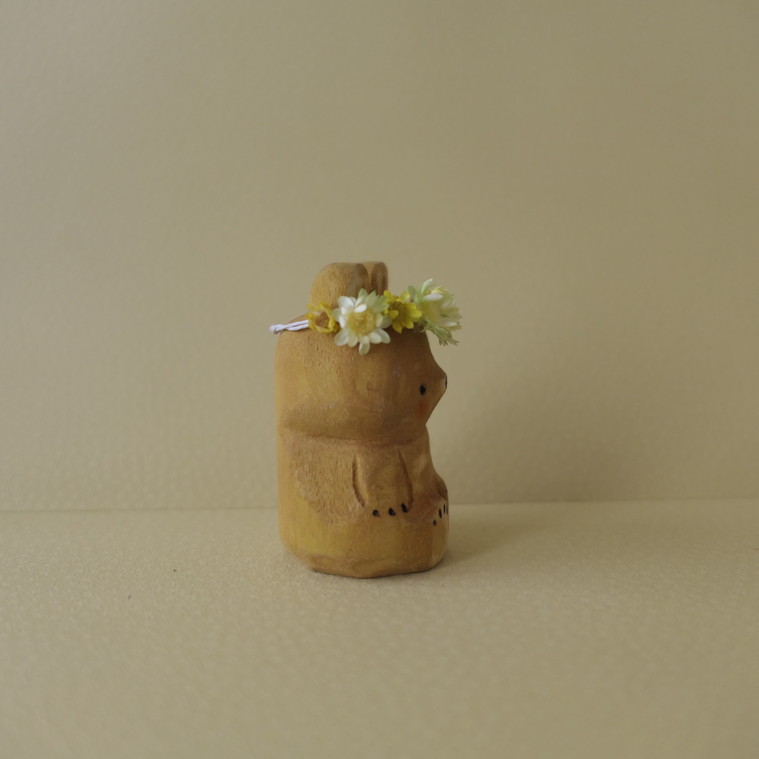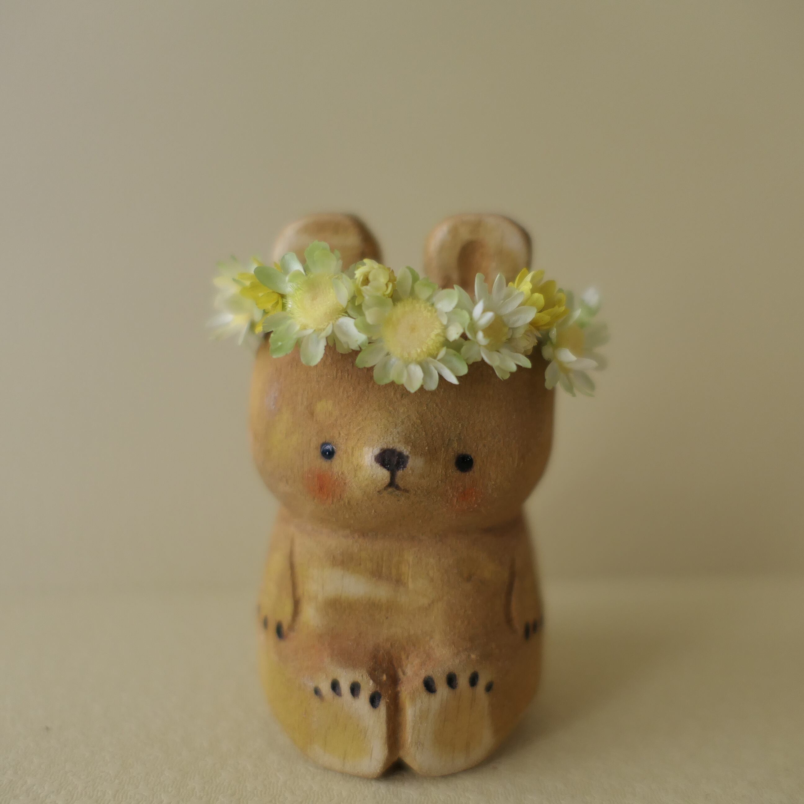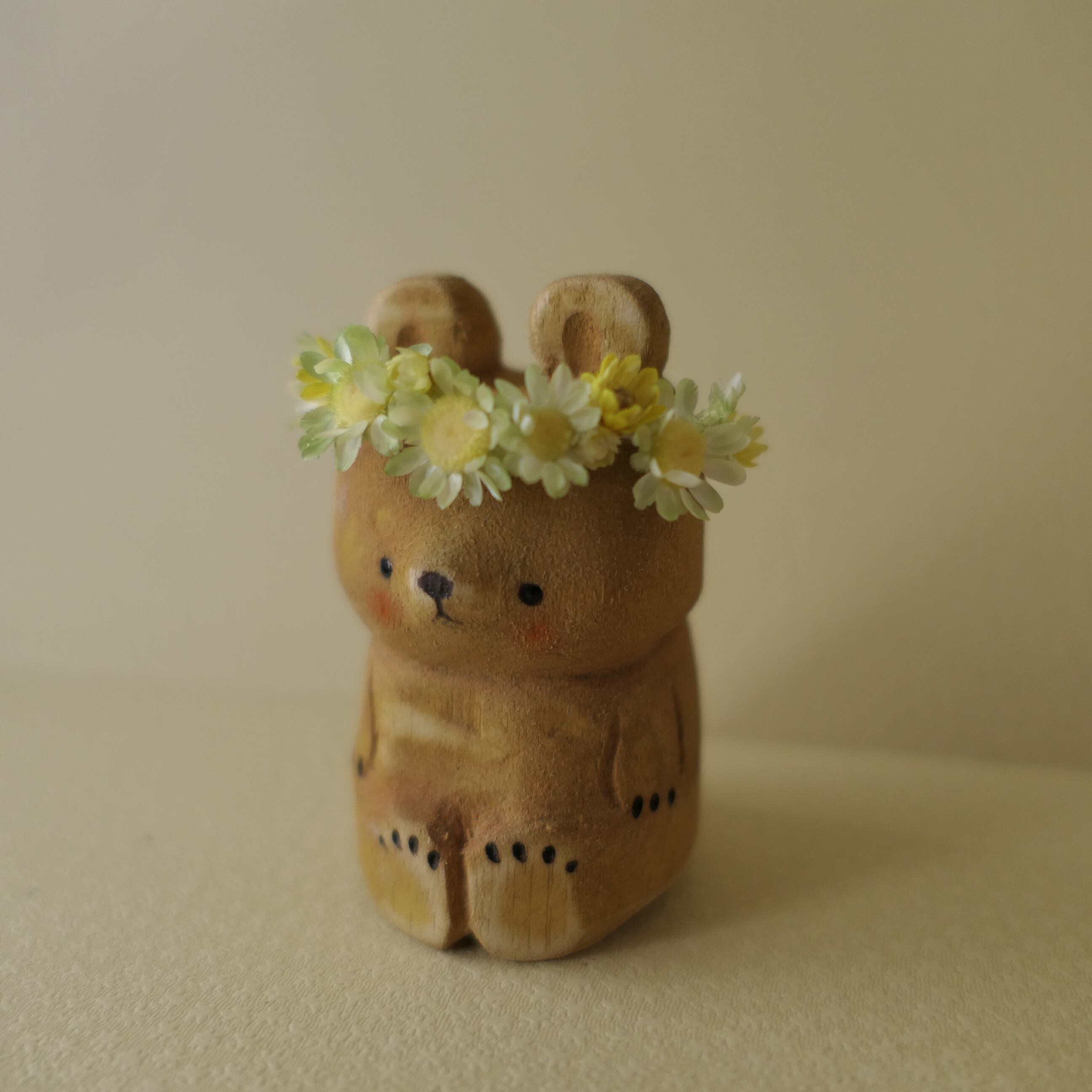 木彫り熊。春の光に誘われて花飾り乗せました。