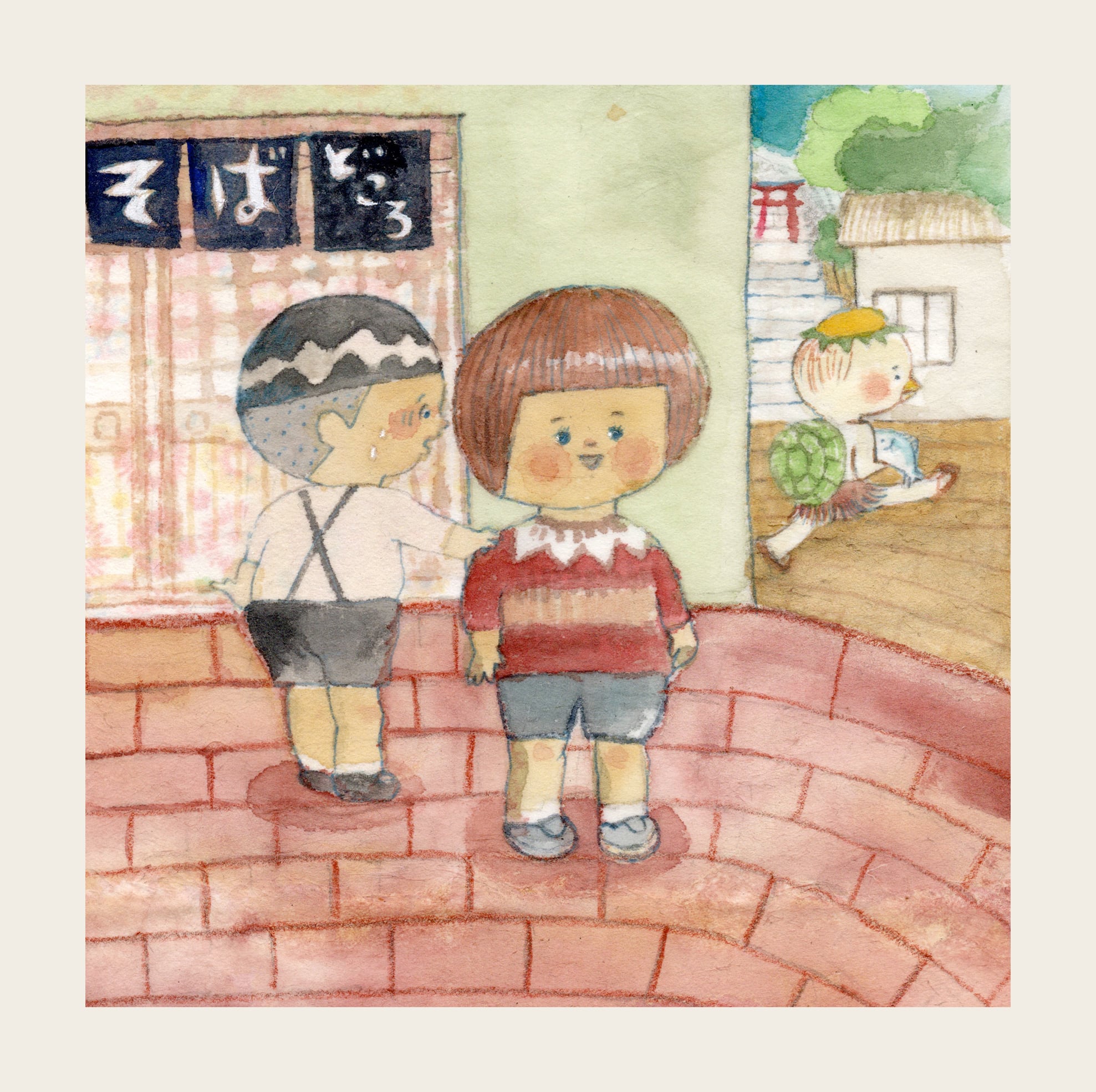 こわがりさんが、おとうふ屋さんの角で初めて河童くんを見かけた瞬間です。