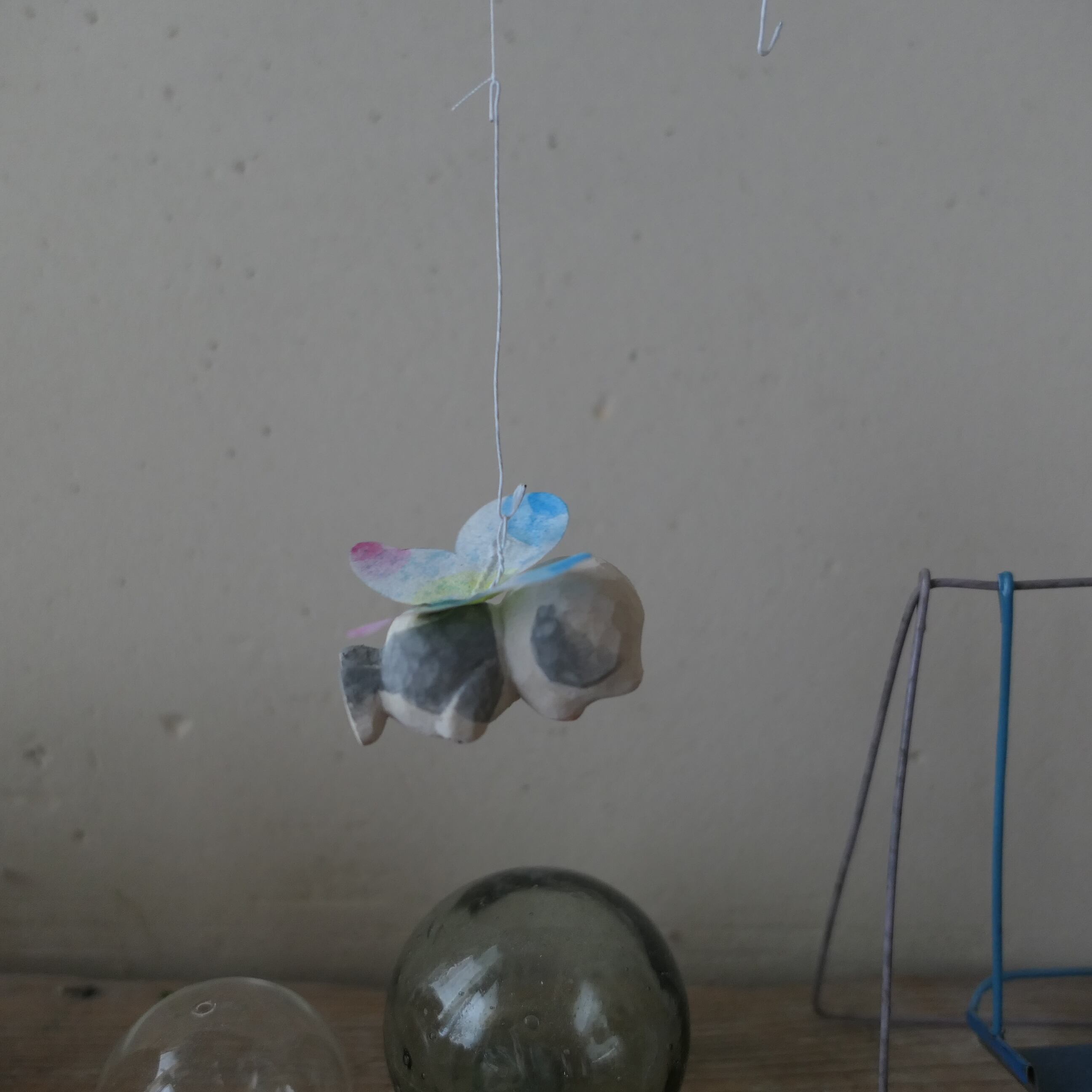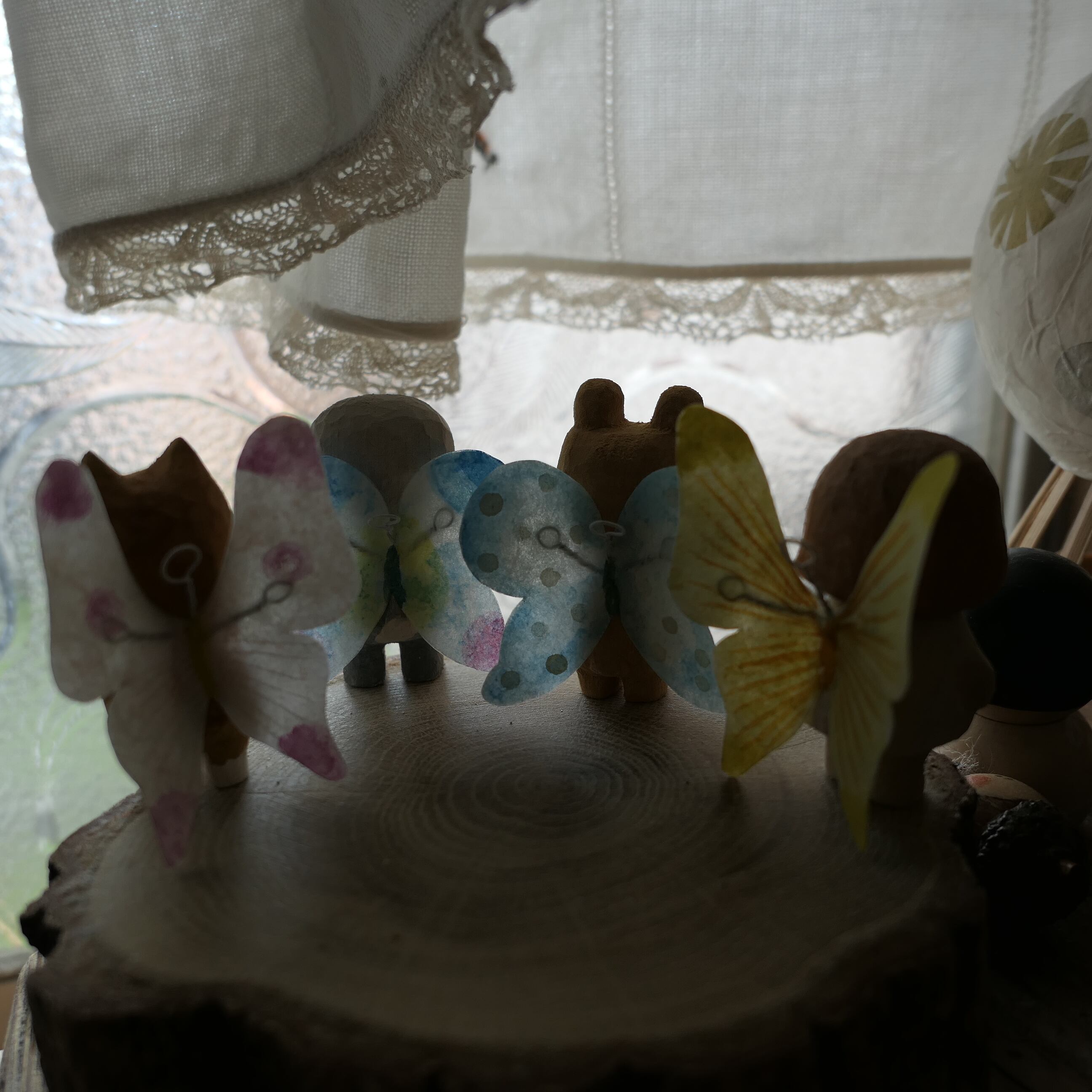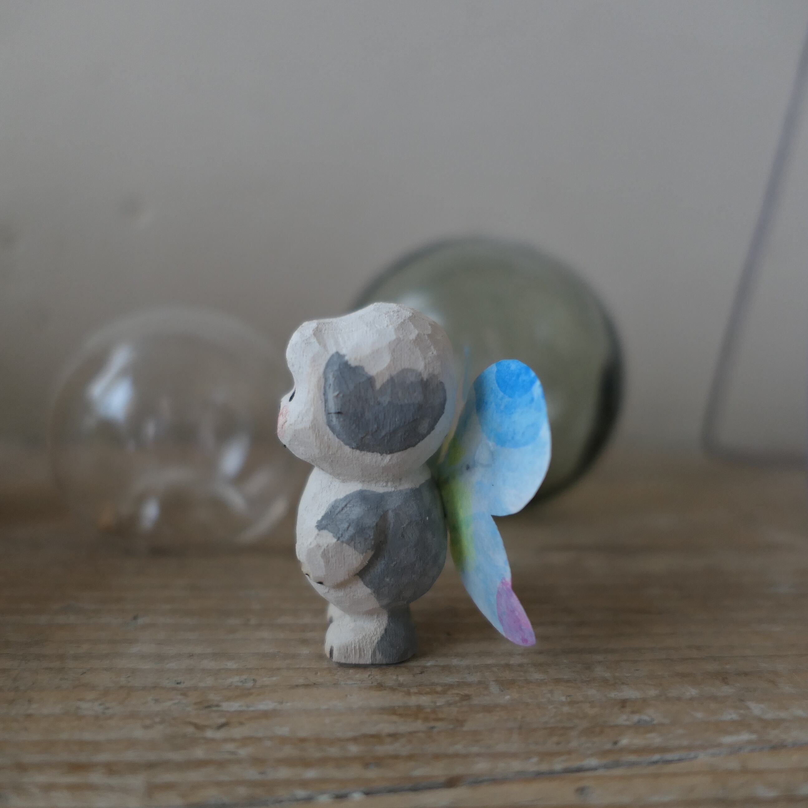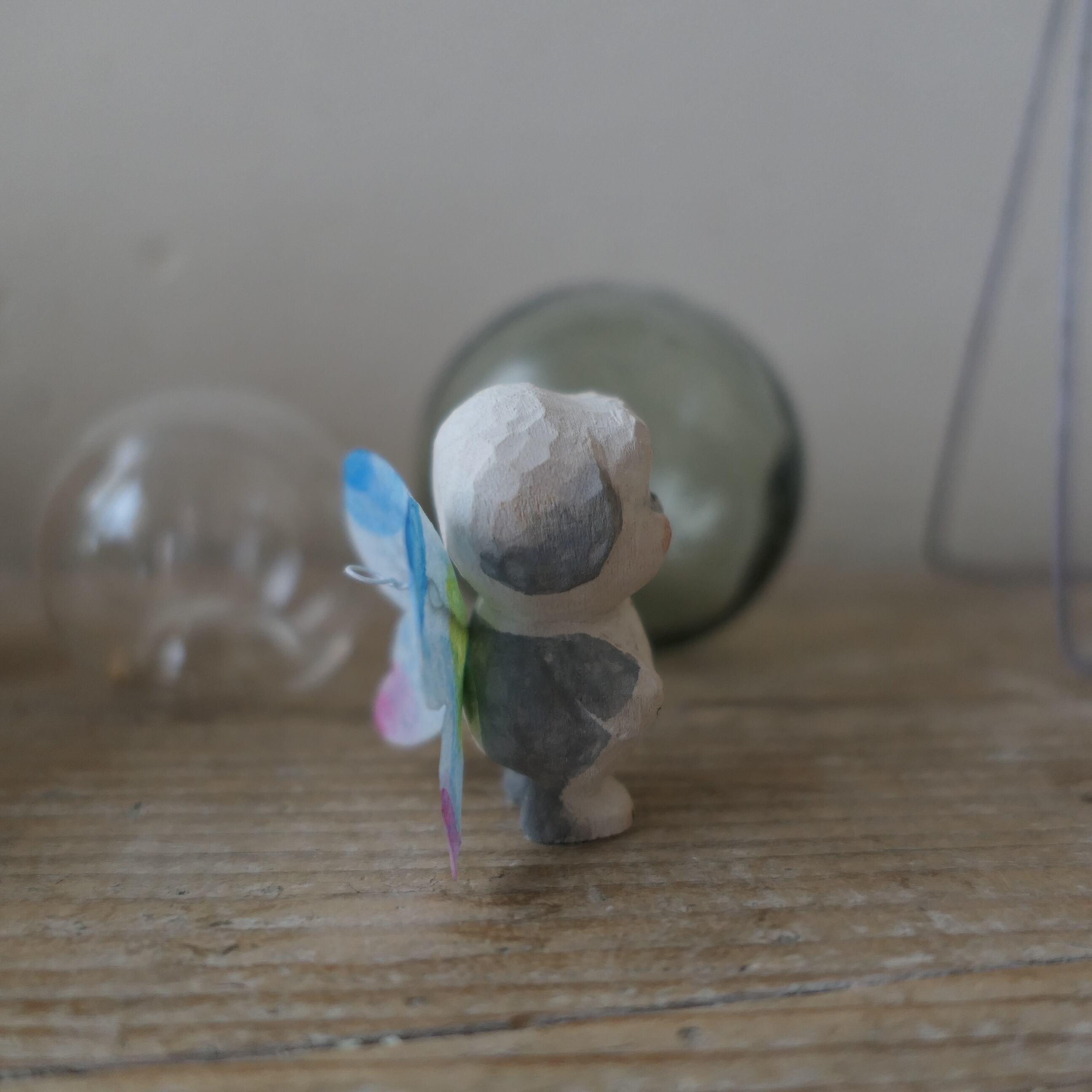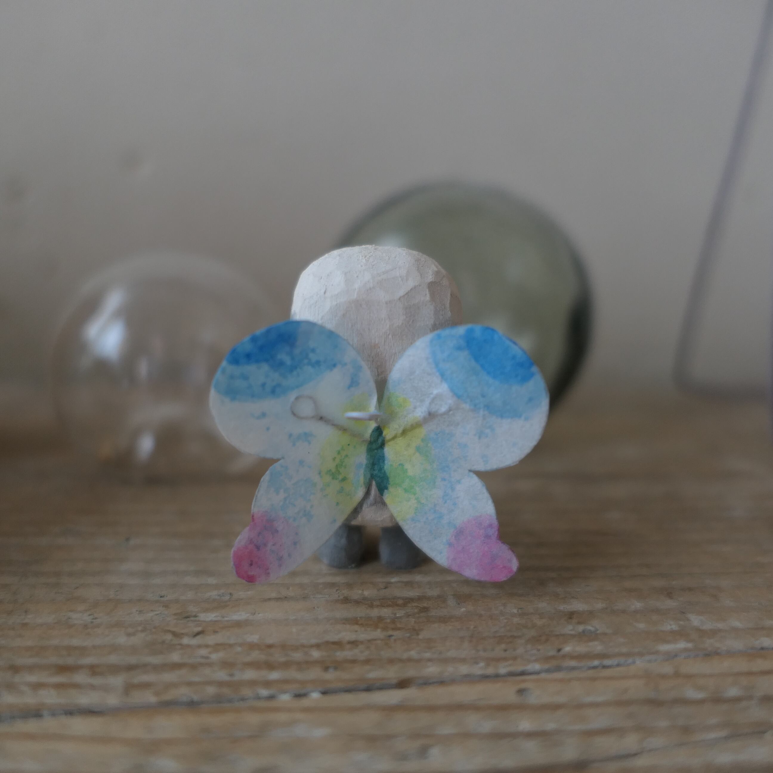 木彫り人形に蝶々の羽が付きました。